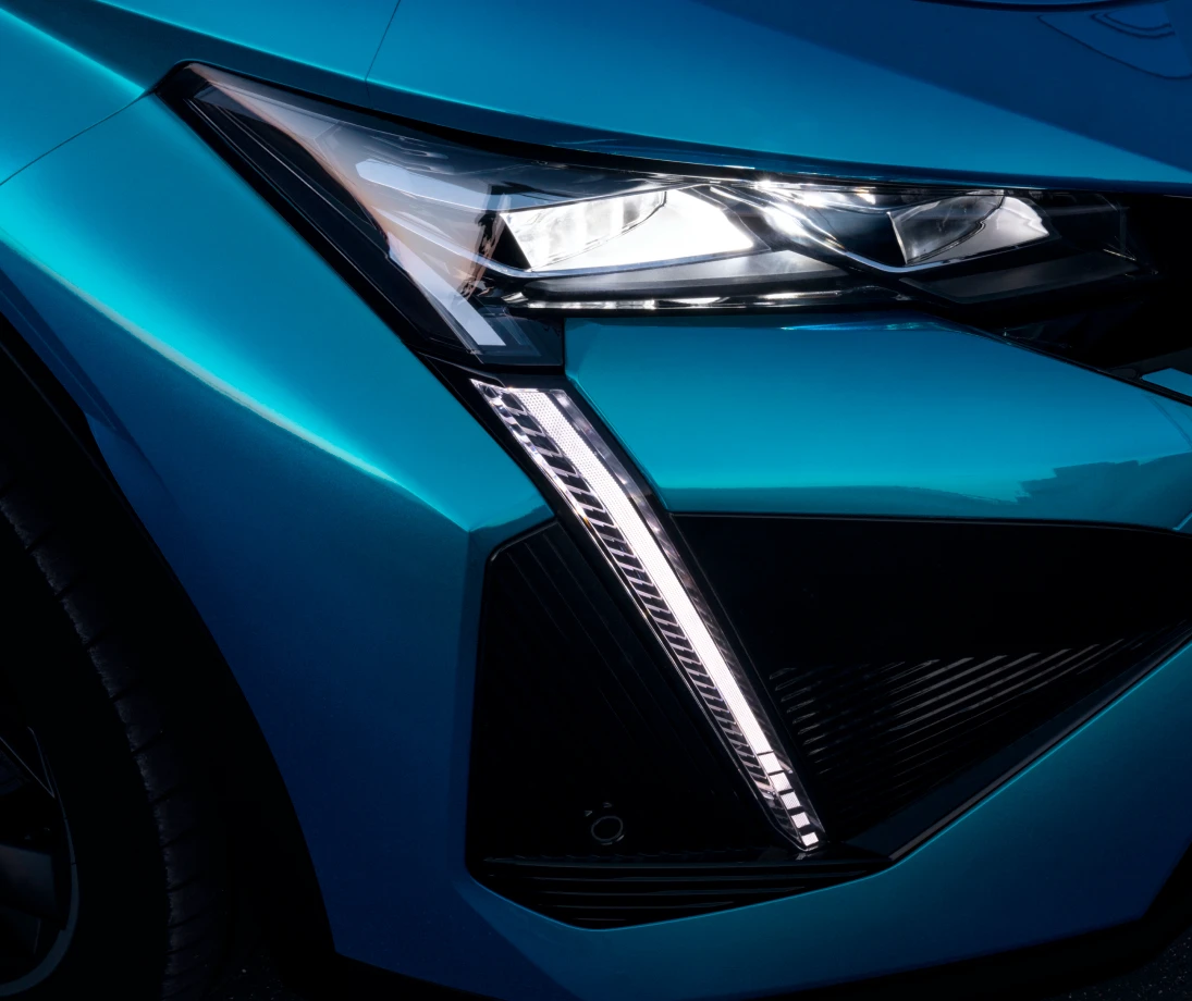 Его львиный прищур узких светодиодных LED фар с функцией автоматического переключения ближнего и дальнего света, оскал вертикальных ходовых огней, рельефный капот, расходящиеся лучи пунктирных элементов решетки радиатора, новый логотип в форме щита, объемные передние крылья, мускулистые переходы в колесные арки, контраст между эффектным цветом кузова и черными декоративными элементами — все это говорит о том, что 408X и его владелец не любят оставаться незамеченными.